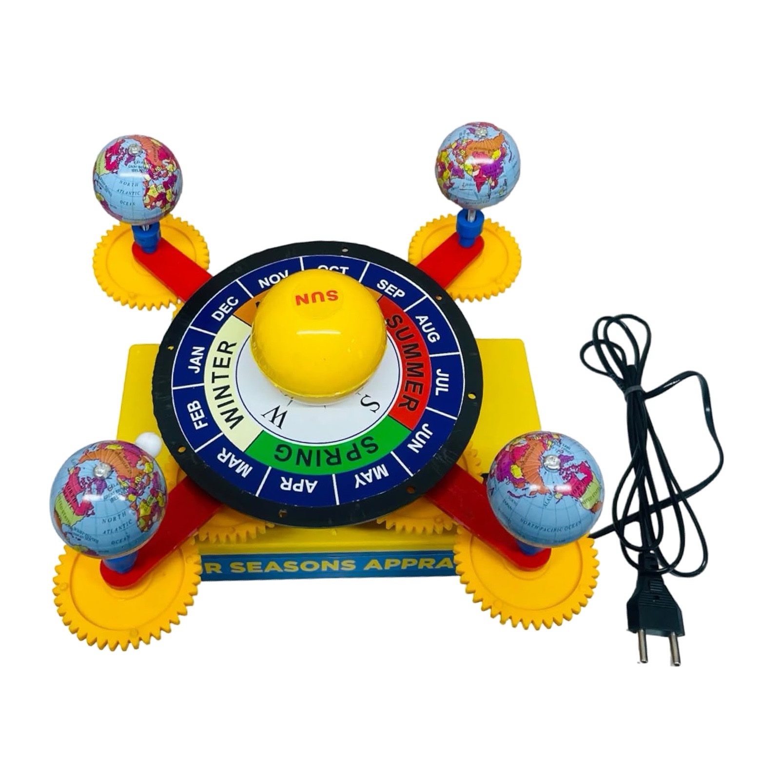 The Four Seasons Working Model is a scientific tool that replicates the Earth’s orbit around the Sun. It demonstrates how the Earth’s 23.5° axial tilt, combined with its annual revolution, causes the occurrence of Spring, Summer, Autumn, and Winter.