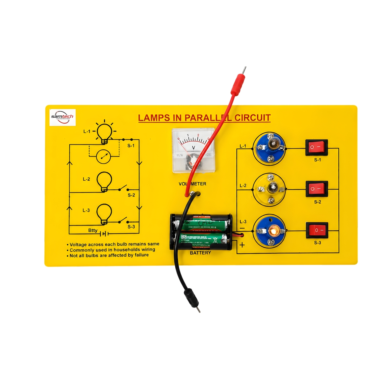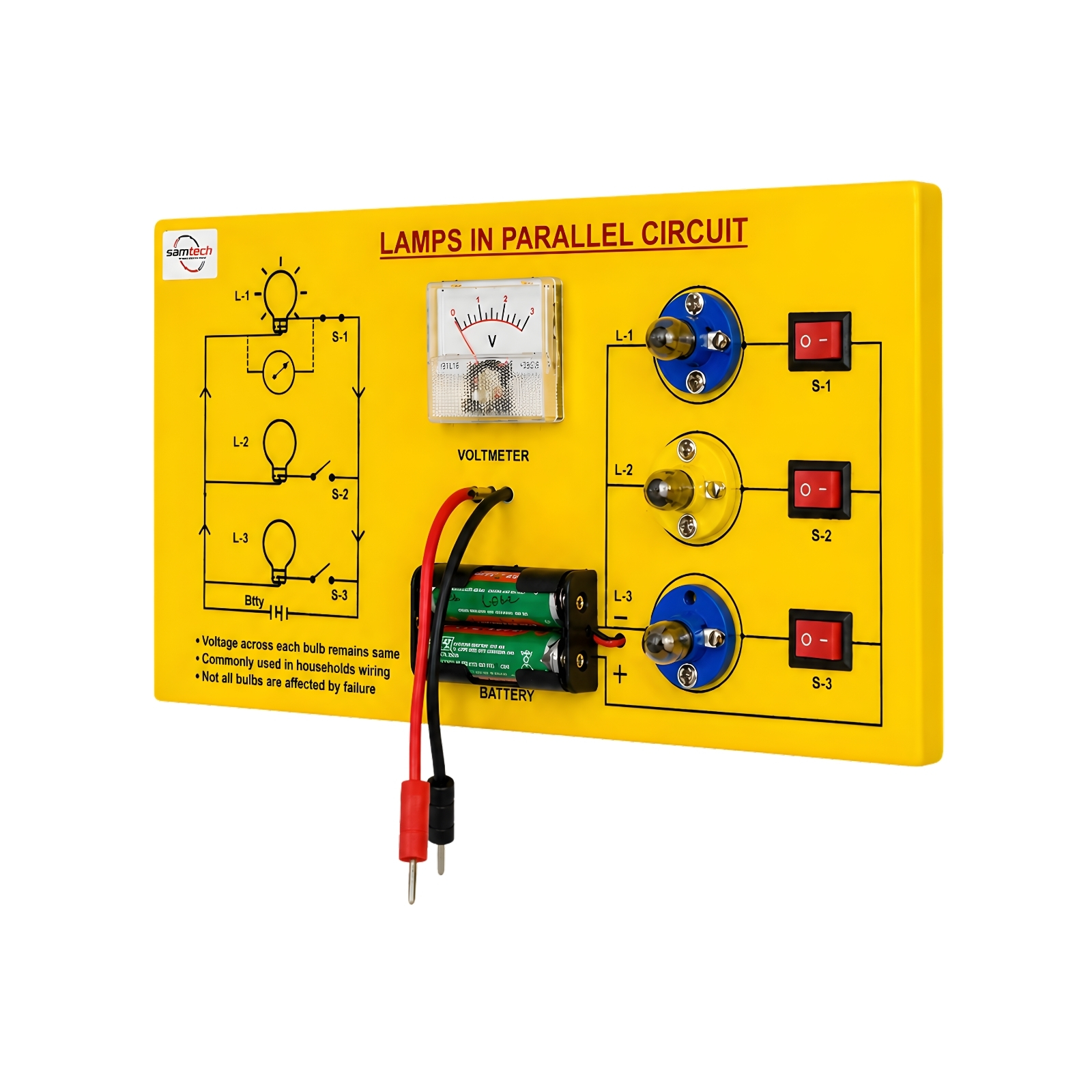 The Lamps in Parallel Kit by Samtech Instruments is an essential educational tool for understanding parallel circuits and voltage distribution. With three bulbs, switches, and a voltmeter, it is perfect for school labs, STEM learning, and practical electricity demonstrations. ⚡💡