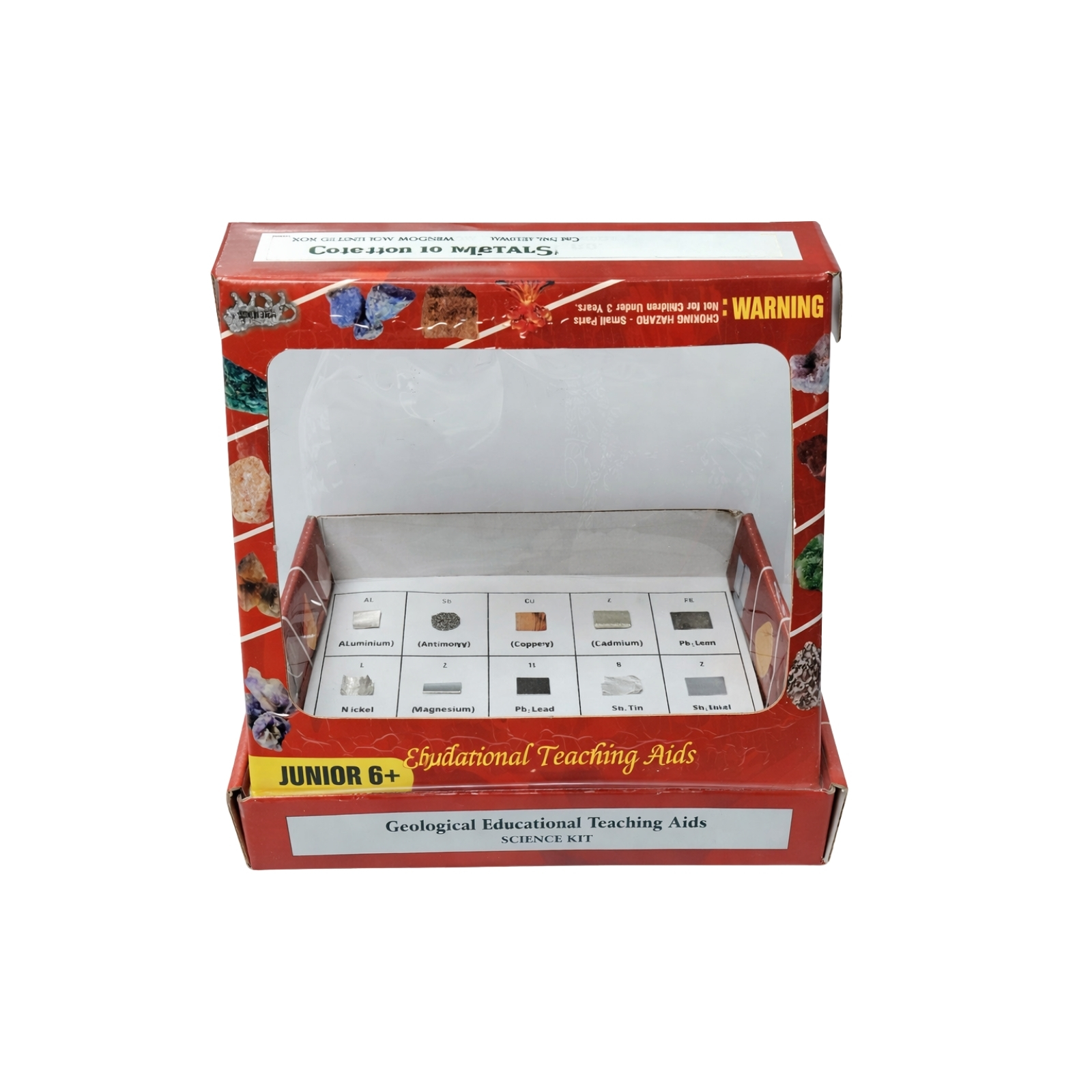 This kit contains real metal specimens mounted in a labeled display box. Each metal sample is clearly identified, allowing students to compare appearance, color, and texture.