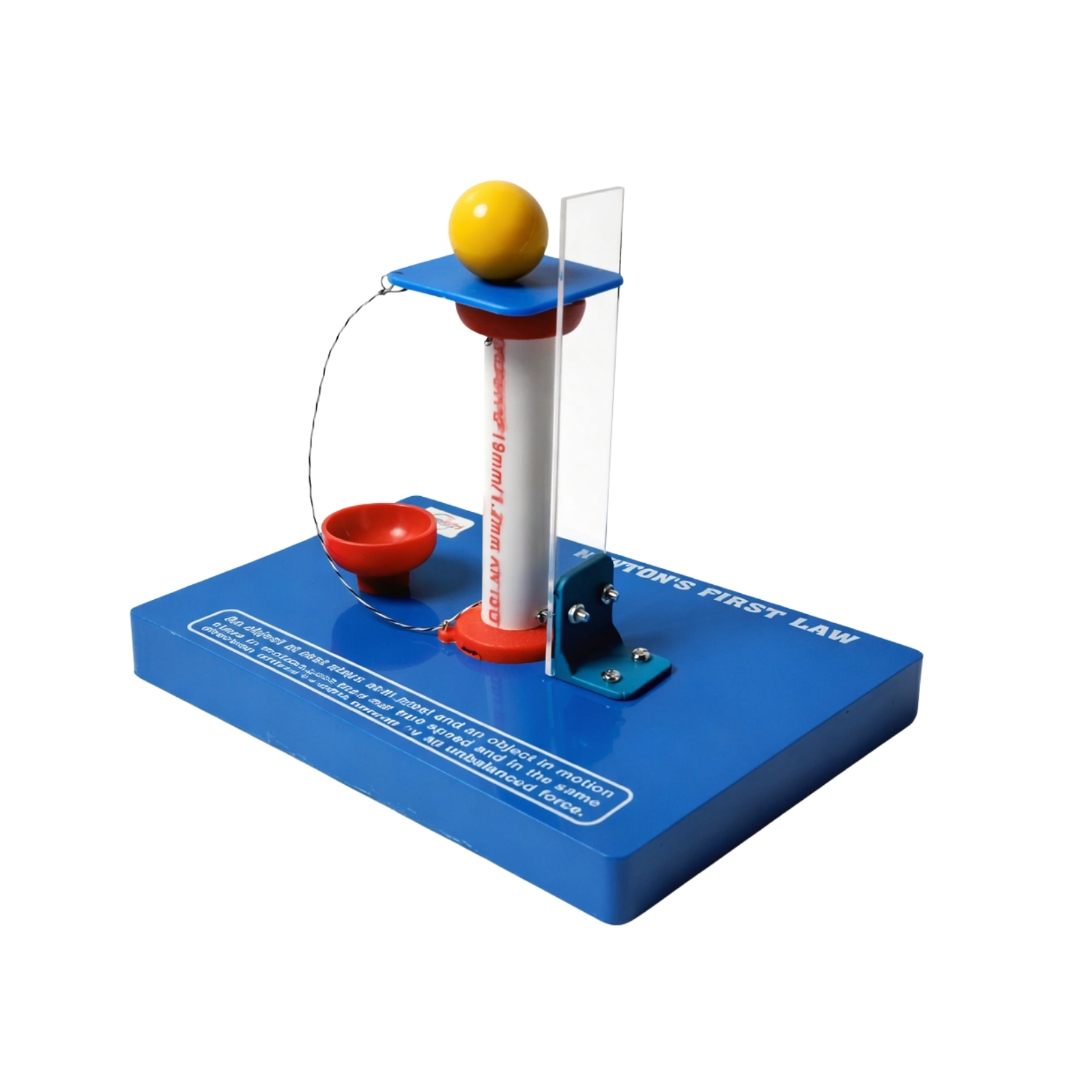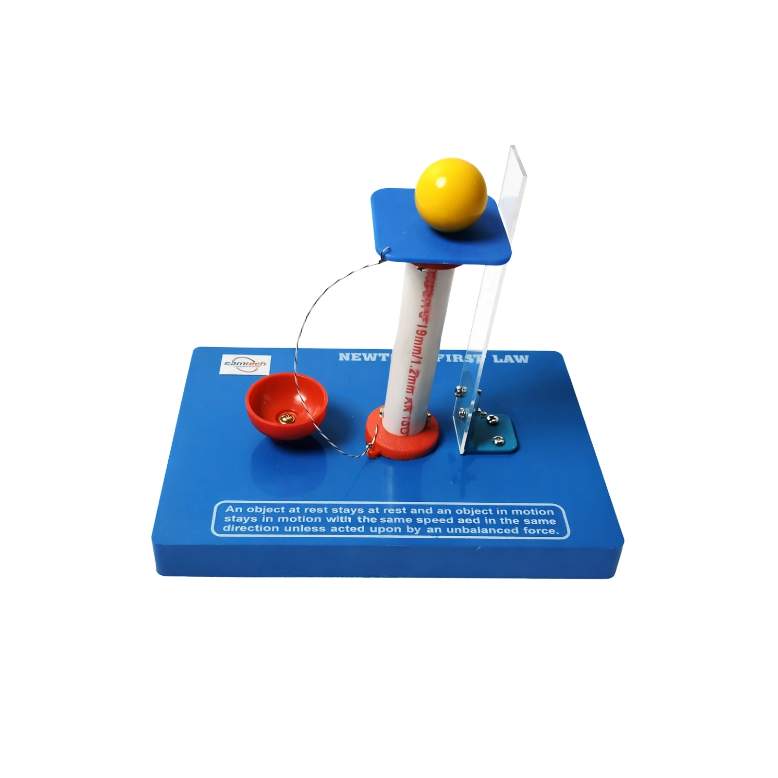 This simple yet effective device uses a bulb, cardboard piece, and an acrylic sheet mounted on a plastic base to show how inertia resists changes in motion.