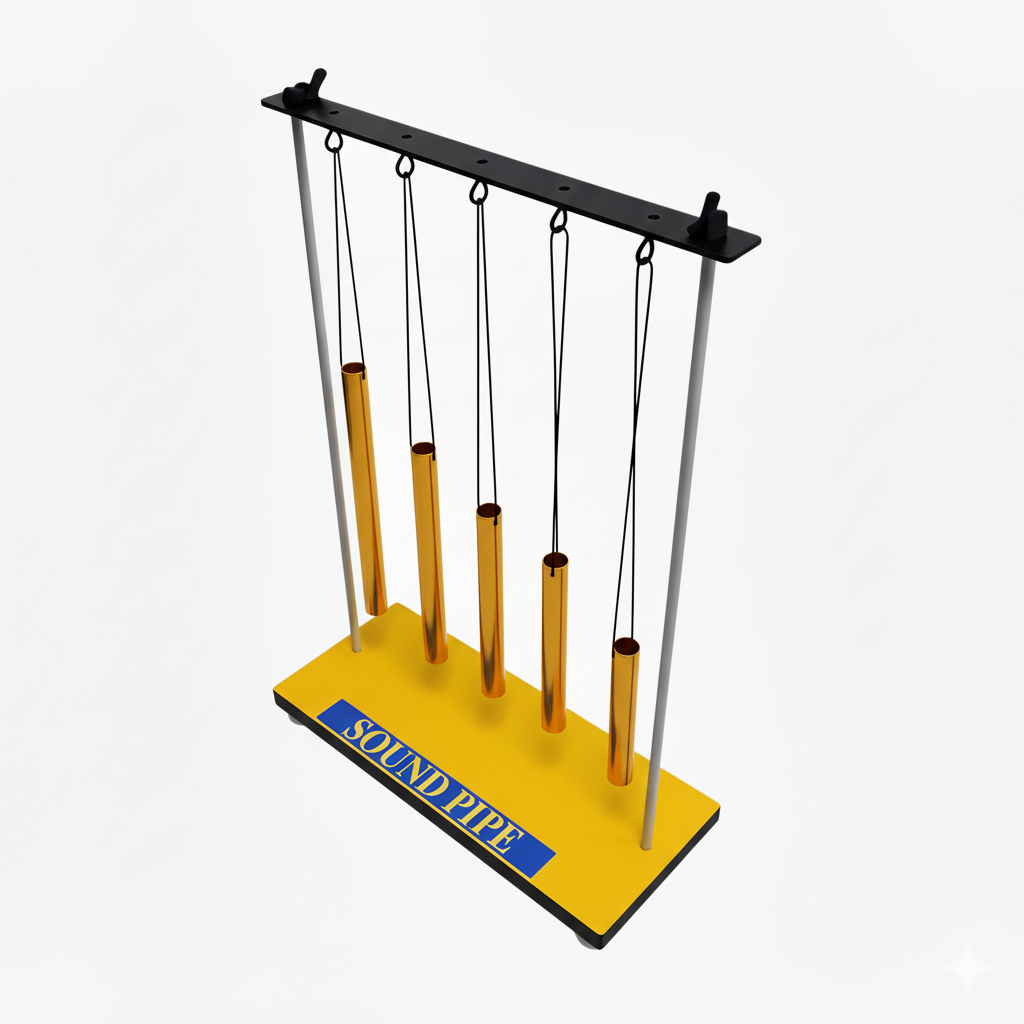 It consists of 7 brass pipes of different lengths (ranging from 10 cm to 30 cm, diameter 1.2 cm), each hung with nylon thread on a sturdy metallic/wooden frame. When struck, each pipe produces a different sound, helping students understand how the length of a vibrating pipe affects pitch.