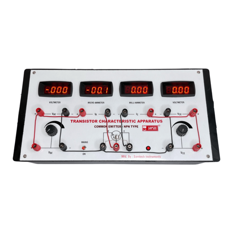 The Transistor Characteristics Apparatus that we have created is designed to help students and electronics enthusiasts understand the characteristics of transistors. The apparatus includes four analog meters for observations of voltage and current, two regulated power supplies of 0-1 V/250 uA and 0-10 V/15 mA, and Transistors NPN and PNP are placed inside the cabinet for doing the common base and common emitter practical.